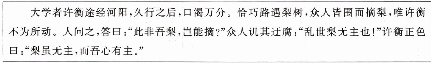 )大学者许衡途经河阳,久行之后,口渴万分。恰巧路遇梨树,众人皆围而摘梨,唯许衡不为所动。人问之,答曰:“此非吾梨,岂能摘?”众人讥其迂腐:“乱世梨无主也!”许衡正色曰:“梨虽无主,而吾心有主。”