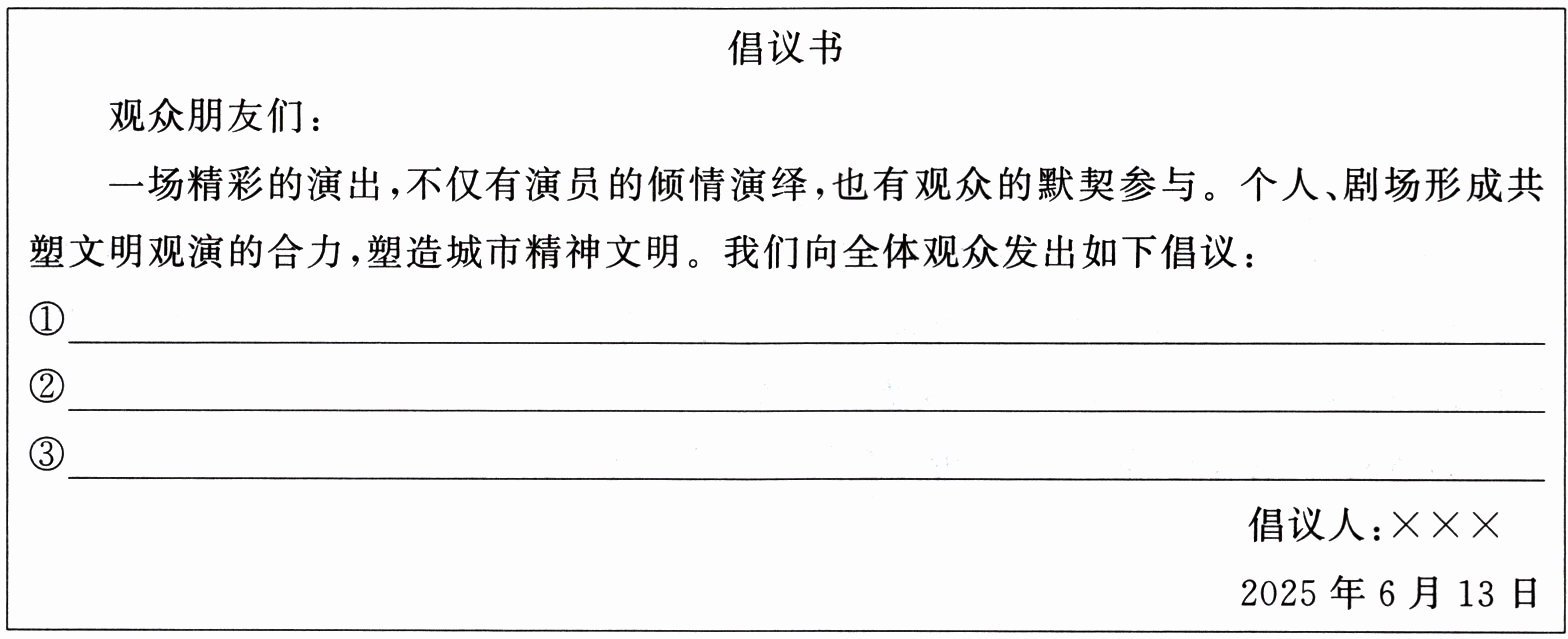 (3) 【我会做】观众恰当的掌声、专注的眼神,将会激发演员临场发挥的激情和灵感;台上台下良性互动,才能成就一场场精彩的演出。请你帮助剧场将下面的文明观演行动倡议书补充完整。