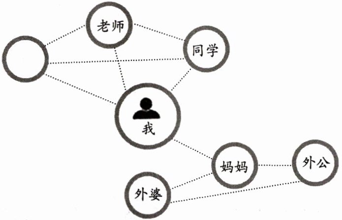 生活中,我们会与父母、同学、老师等产生不同的联系。为了更好地定位自己,请你在图中完善自己的社会关系网络图,然后思考以下问题: