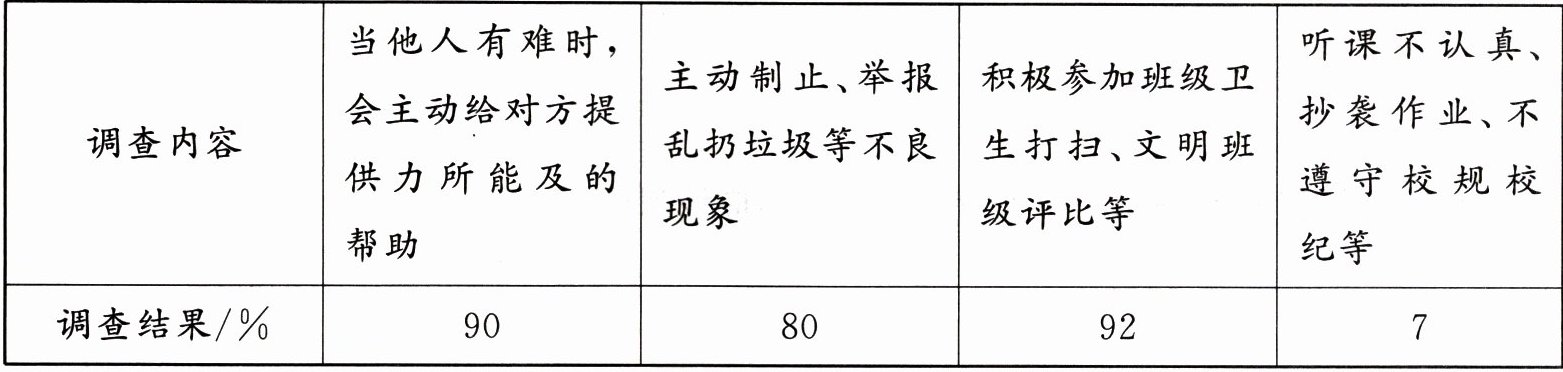(1)表中调查结果说明该校大部分师生具有较强的责任意识,能够积极承担对他人、对集体、对社会的责任(如主动帮助他人、制止不良现象、参与集体事务),不良行为(如不遵守校规等)比例较低,责任意识普遍较强。