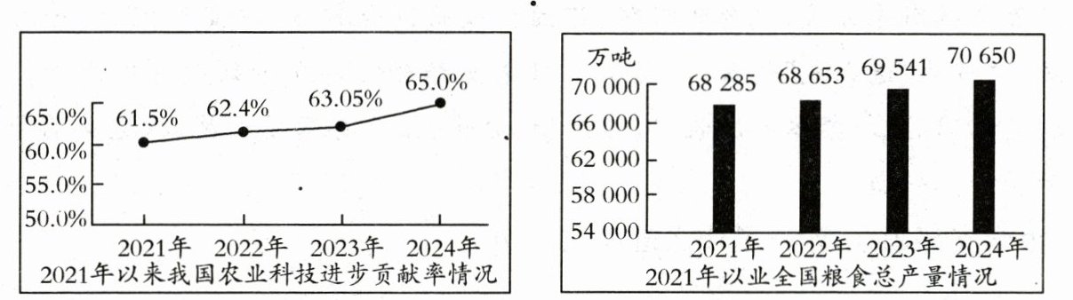 12. (2025·四川南充中考)下图是我国 2021 年至 2024 年农业科技进步贡献率和全国粮食总产量情况。据此,可推断我国(