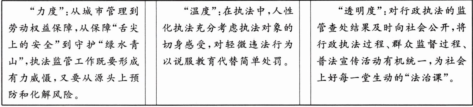 材料一:行政执法工作是社会治理的重要一环,同百姓生活息息相关。我国行政执法工作做到了“三度”,获得广泛好评。