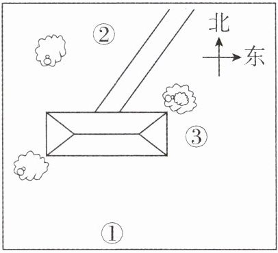 3. 右图是在空中看到的一个小院的画面,房子西北方向有一棵树,东北方向有一棵树,房后有一棵树,门前有一条小路。
