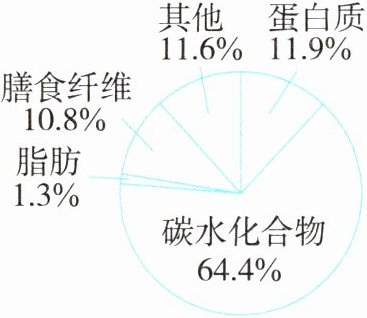 (2)50×11.9% = 5.95(kg) 50×64.4% = 32.2(kg) 50×1.3% = 0.65(kg) 50×10.8% = 5.4(kg) 答:蛋白质有5.95kg,碳水化合物有32.2kg,脂肪有0.65kg,膳食纤维有5.4kg。解析:找到小麦的总千克数乘对应的百分率,就能求出对应的具体量。