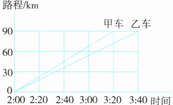 (2)$90÷1\frac{1}{3}=67.5$(km/h) $90÷1\frac{2}{3}=54$(km/h) 答:甲车的速度是67.5 km/h,乙车的速度是54 km/h。 解析:关键从图中找到甲与乙的行程时间,再用路程除以时间,算出速度。