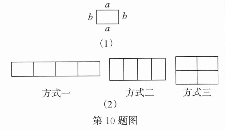 10. 有 4 张相同的长方形纸片,各边长如图(1)所示($ a > b $),将它们拼成较大的长方形,共有如图(2)所示的 3 种不同方式。