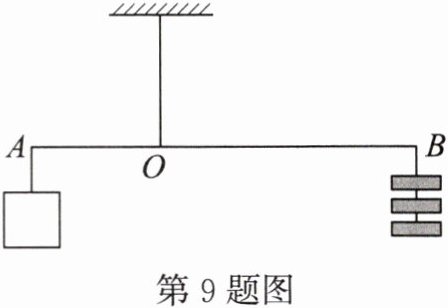 9. 数学课外活动小组的同学用一根质地均匀的轻质木杆和若干个钩码做实验。如图所示,在轻质木杆 $ O $ 处用一根细线悬挂,左端 $ A $ 处挂一重物,右端 $ B $ 处挂钩码,每个钩码的质量是 $ 500g $。若 $ OA = 15cm $,$ OB = 30cm $,挂 3 个钩码可使轻质木杆水平位置平衡。若轻质木杆的质量忽略不计,设这个重物的质量为 $ xg $,根据题意可列方程为(