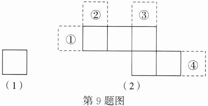 9. 图(1)和图(2)中所有的正方形都全等,将图(1)的正方形放在图(2)中的①②③④某一位置,所组成的图形不能围成正方体的位置是(