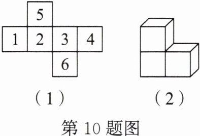 10. (2023·青岛中考)一个不透明小立方块的六个面上分别标有数字1,2,3,4,5,6,其展开图如图(1)所示。在一张不透明的桌子上,按图(2)方式将三个这样的小立方块搭成一个几何体,则该几何体能看得到的面上数字之和最小是(