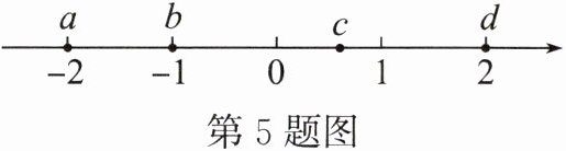5. (2024·青岛中考)实数$a$,$b$,$c$,$d$在数轴上对应点的位置如图所示。这四个实数中,绝对值最小的是(