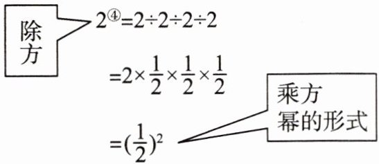 $\begin{array}{c}\boxed{除方} \\2^{\circledcirc 4} = 2 ÷ 2 ÷ 2 ÷ 2 \\= 2 × \dfrac{1}{2} × \dfrac{1}{2} × \dfrac{1}{2} \\= \left( \dfrac{1}{2} \right)^{2} \\\boxed{乘方幂的形式}\end{array}$