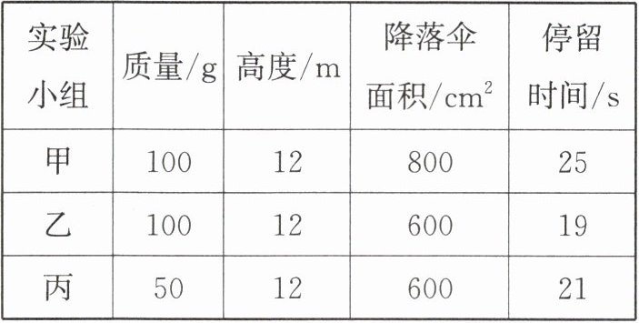 的实验数据,结论是在降落伞所处的高度和降落伞面积不变时,降落伞越轻,在空中停留的时间越长