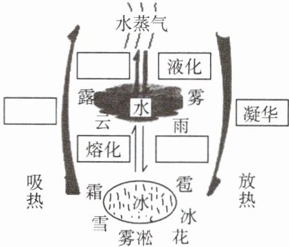 1. 完成下图,在方框内填上物态变化的名称,左侧的物态变化都是吸热的,右侧的物态变化都是放热的。