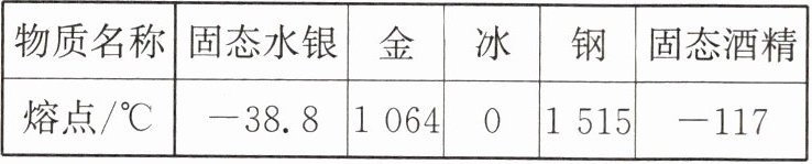 )|物质名称|固态水银|金|冰|钢|固态酒精|