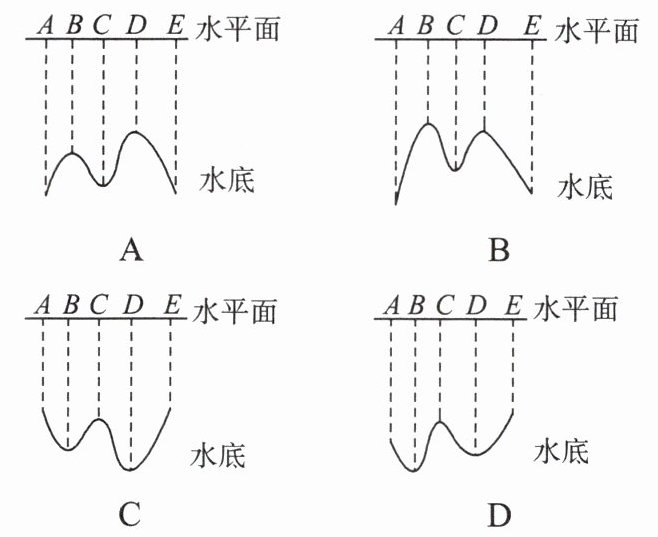 3. 某科技小组利用声呐系统测绘汉江水域水底的形状。当测量船驶过汉江某水平面的A、B、C、D、E五个位置时,向水底定向发射超声波,测得回收信号的时间分别为0.15s、0.27s、0.13s、0.20s、0.13s。该小组推出该水域水底的大致形状应该是(