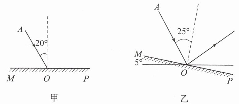 3. 如图甲所示,光线 AO 以 20°的入射角射到平面镜 MP 上,现将平面镜左边向上、右边向下顺时针转动 5°后,如图乙所示,反射光线与入射光线之间的夹角为(