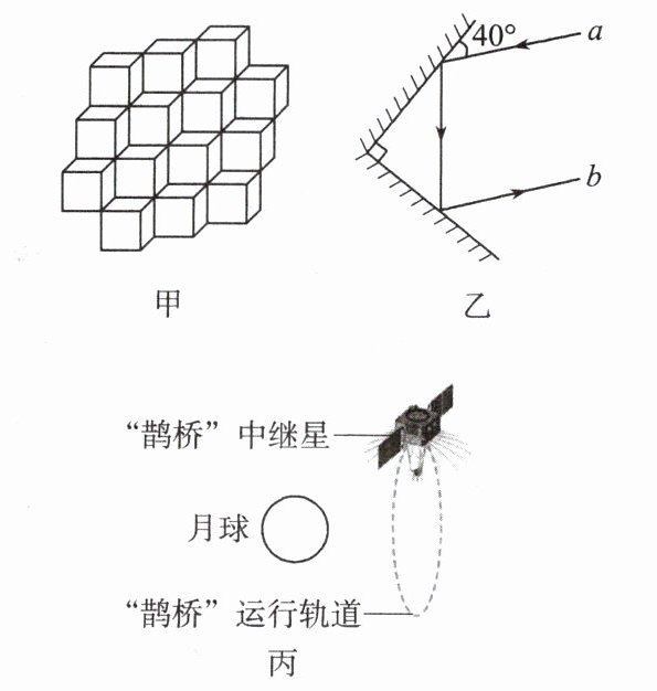 4. (跨学科)“鹊桥”是“嫦娥四号”月球探测器的中继卫星,与地球相距 45 万公里。利用“鹊桥”上携带的激光角反射器(示意图如图甲所示),可进行地月激光测距试验。如图乙所示,角反射器由相互垂直的小平面镜组合而成,激光射向它时,能被其“反向射回”。