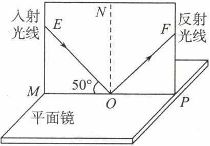 2. 小明同学在家里将一个平面镜放在水平桌面上,再把一张可沿 ON 折叠的硬白纸板 ENF 竖直的立在平面镜上,以此来探究光的反射规律。通过测量他发现此时入射光线与平面镜成 50°夹角,如图所示,则(