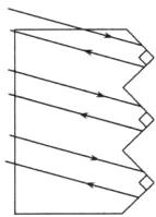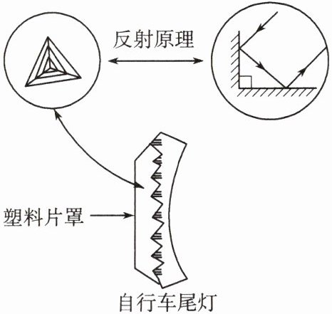 (提示:如图是自行车尾灯的结构,红色且互相垂直的三角形小玻璃类似于两块互相垂直的平面镜,注意比较入射光线与反射光线的方向)