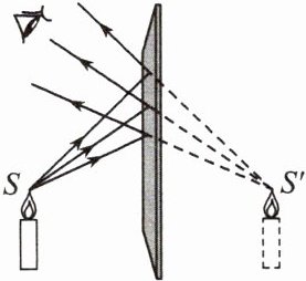 1. 将点燃的蜡烛放在平面镜前,我们从平面镜中看到点燃蜡烛的像,点燃蜡烛的火焰最高点为 S,经平面镜反射后的光路图如图所示。下列说法中不正确的是(