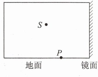 28. 如图所示,在舞蹈室的墙面上装有一块平面镜,王老师用一激光笔从 S 点照向镜面,在地面上 P 点看到一光斑,请用平面镜成像的特点完成光路图。