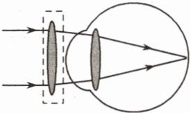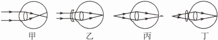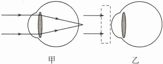 (在图乙中虚线框内画一个凸透镜,位于原晶状体左侧,使光线经过凸透镜后会聚一些,然后再经过眼睛的晶状体后,光线正好会聚在视网膜上,完成光路图)。