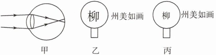 6. 如图甲是小明同学眼睛的成像光路图,乙、丙是对应着同一个字成像的两类不同透镜。问小明是近视眼还是远视眼,以及应戴由哪类透镜做成的眼镜(