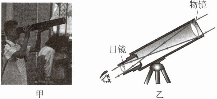 1. 如图甲所示是福建的一位天文爱好者通过纯手工打磨镜片自制的望远镜,该望远镜不仅可以看到8亿公里外的木星,甚至能清晰地看到木星表面的斑纹,图乙是该望远镜内部结构及光路示意图。下列关于该自制望远镜的说法正确的是(