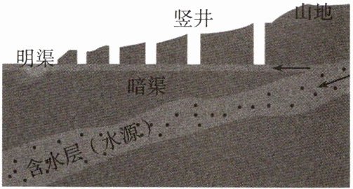 13. (跨学科)吐鲁番是全国有名的“火炉”,常年高温少雨,水贵如油。当地流行使用坎儿井,坎儿井有明渠、暗渠、竖井组成(如图)。暗渠即地下水道,是坎儿井的主体,宽约 $1.2m$。井的深度因地势和地下水位高低不同而有深有浅,最深的井可达 $90m$ 以上,井内的水在夏季约比外界低 $5~10^{\circ}C$。坎儿井是通过