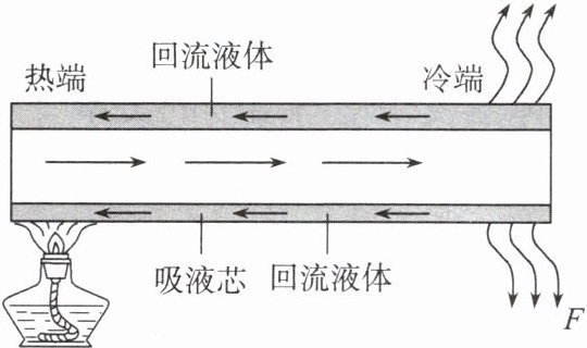 12. (跨学科)“热管”是一种导热本领非常大的装置,它比铜的导热本领大上千倍。如图所示,“热管”的结构并不复杂,它有一根两端封闭的金属管,管内衬了一层多孔的材料,叫作吸收芯,吸收芯中充有酒精或其他容易汽化的液体,当管的一端受热时,这一端吸收芯中的液体就