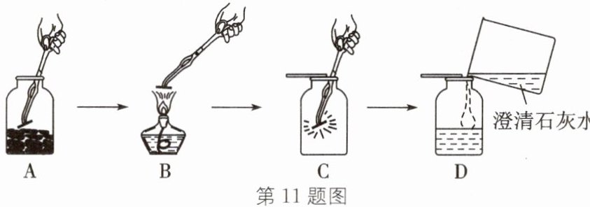 11. 如图所示是木炭在氧气中燃烧的实验操作,试回答下列问题。