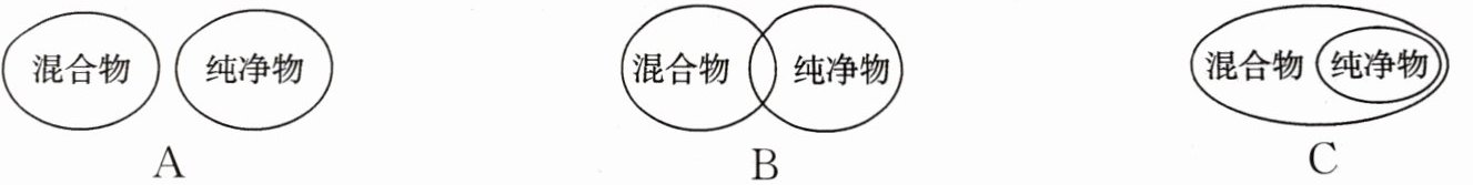 (填“A”“B”或“C”)。(3)你认为“纯净物”与“混合物”两个概念的图示是下列的