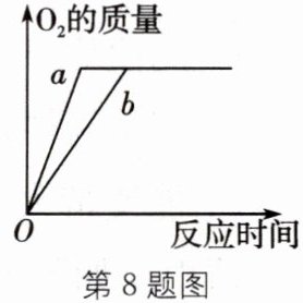 8. 将 100 mL 双氧水均分成甲、乙两份,仅向甲中加入适量的二氧化锰,反应生成氧气质量与反应时间的关系如图所示。下列从图中不能获取的信息是(