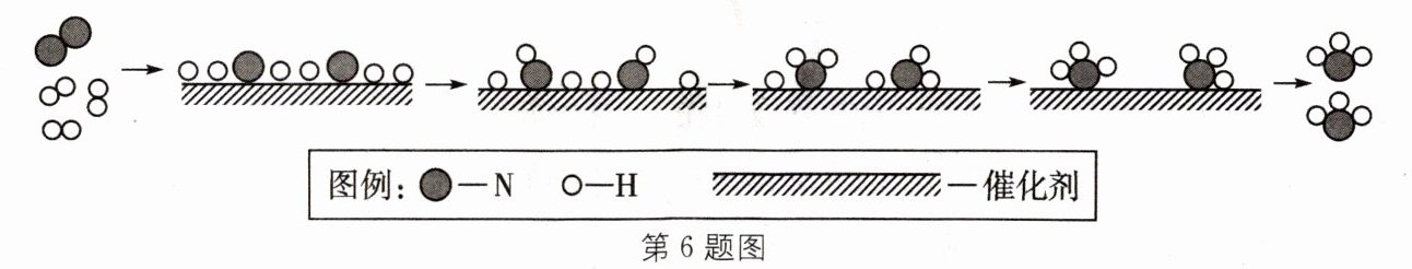 6. 在催化剂作用下,$N_{2}$ 和 $H_{2}$ 反应生成 $NH_{3}$ 的微观过程示意如下。下列说法正确的是(