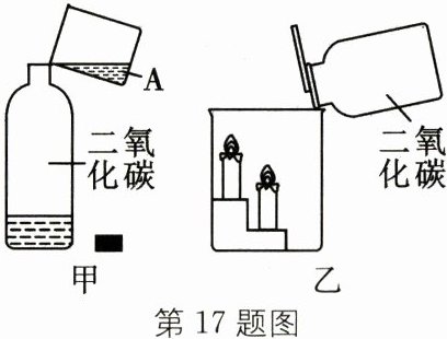 17. 如图甲是二氧化碳的溶解性实验。向一个收集满二氧化碳气体的质地较软的塑料瓶中加入约1/3体积的水,立即旋紧瓶盖,观察塑料瓶的变化。请回答: