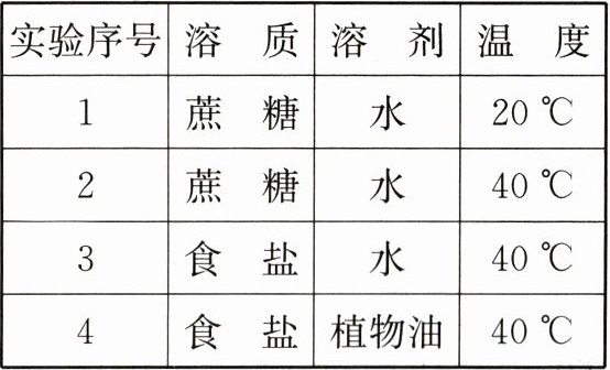 7. 为了探究影响物质溶解性的因素,设计了如表所示的实验方案,该实验无法探究的因素是(