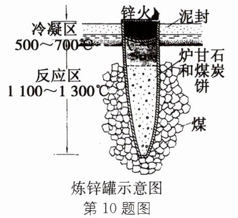 10. (2023·巴中)明代宋应星所著《天工开物》一书,介绍了“火法炼锌”的方法:把炉甘石($ {ZnCO_{3}} $)和煤炭饼装入炼锌罐,如图所示,泥封、“其底铺薪,发火煅红”“冷定毁罐取出”。下列说法错误的是(