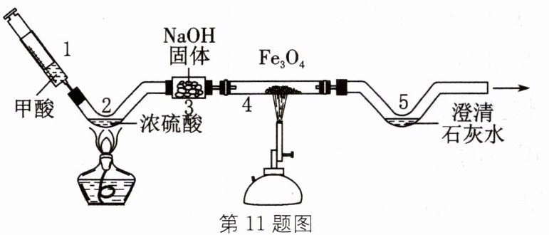 11. 同学们利用自制仪器模拟工业炼铁实验,用如图所示微型实验装置制取 CO,然后用 CO 还原 $ {Fe_{3}O_{4}} $ 并检验气体产物。已知甲酸($ {HCOOH} $)具有挥发性,在热的浓硫酸中分解生成一氧化碳和水。(已知氢氧化钠能与 $ {CO_{2}} $ 反应)