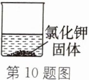 10. (2023·杭州)已知氯化钾的溶解度随温度升高而增大。向盛有$40g氯化钾的烧杯中加入100g$水,充分搅拌溶解后现象如图所示。此时溶液温度为$20^{\circ}C$,下列说法正确的是(