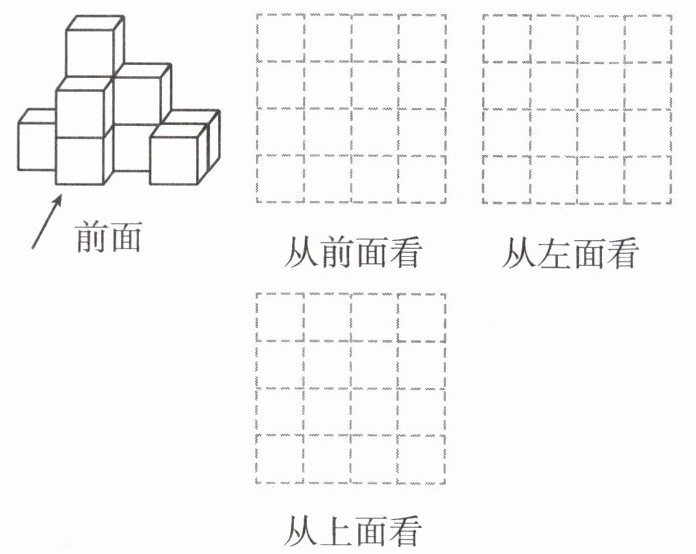 例3 由10个大小相同的正方体搭成的立体图形如图所示,请在网格中画出从前面看、从左面看、从上面看得到的平面图形。