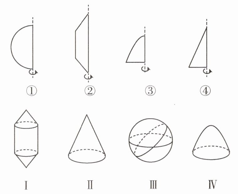 例3 如图,将图中①~④的平面图形绕轴旋转一周,可以得到Ⅰ~Ⅳ的几何体,请你指出有对应关系的平面图形与几何体.