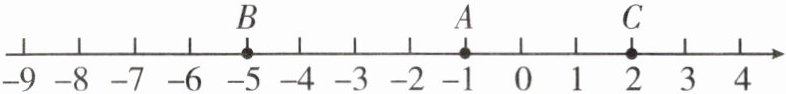 数轴上点$B在-5$,点$A在-1$,点$C$在2。