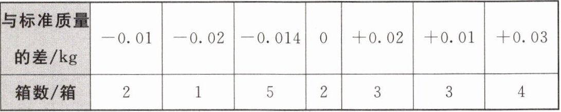 |与标准质量的差/kg| -0.01 | -0.02 | -0.014 | 0 | +0.02 | +0.01 | +0.03 |