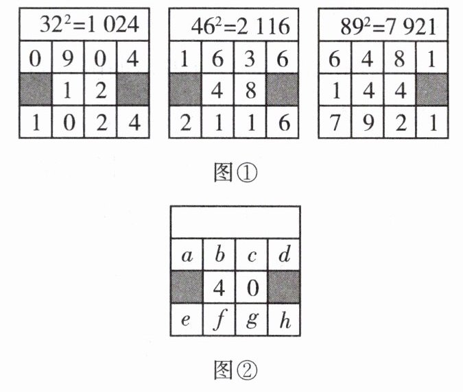 7. 在求两位数的平方时,可以用“列竖式”的方法进行速算,求解过程如图①所示.仿照图①,用“列竖式”的方法计算一个两位数的平方,过程部分如图②所示,求$a + b + c + d + e + f + g + h$的值。