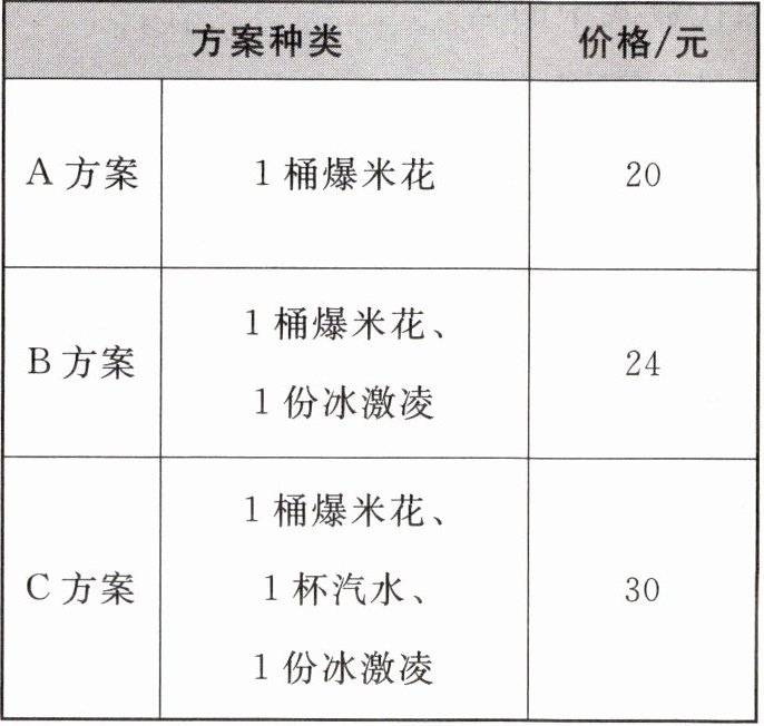|C 方案 1 桶爆米花、1 杯汽水、1 份冰激凌|30|