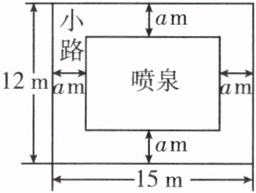 6. 如图,某中学为美化校园环境,计划在一块长为 $ 15 m $、宽为 $ 12 m $ 的空地上修建一个长方形喷泉,喷泉的周围修建等宽的小路,路宽为 $ a m $.