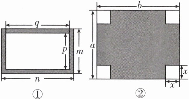 解 图①中阴影部分的面积为mn-pq,图②中阴影部分的面积为ab-4x². 当a=$\frac{5}{2}$,b=3,x=$\frac{1}{2}$时,ab-4x²=$\frac{5}{2}×3-4×(\frac{1}{2})²=\frac{15}{2}-1=\frac{13}{2}$.