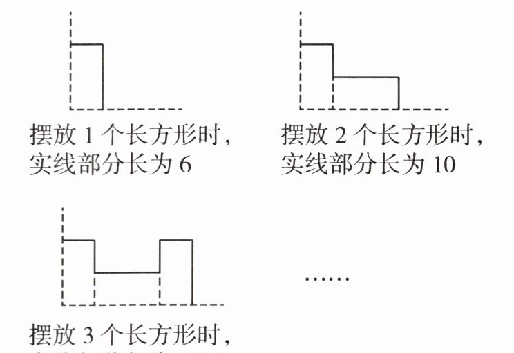 616 解析 第1个图实线部分长为6,第2个图实线部分长为6+4,第3个图实线部分长为6+4+6,第4个图实线部分长为6+4+6+4,第5个图实线部分长为6+4+6+4+6,第6个图实线部分长为6+4+6+4+6+4,……从上述规律可以看到,对于第n个图形,当n为奇数时,第n个图形实线部分长为$\frac{1}{2}×(6+4)(n-1)+6$.当n为偶数时,第n个图形实线部分长为$\frac{1}{2}(6+4)n$,所以摆放123个长方形时,实线部分长为$\frac{1}{2}×(6+4)×(123-1)+6=616$.