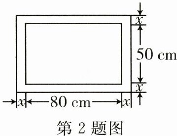 2. 如图,在一幅长为 $80 cm$,宽为 $50 cm$ 的矩形风景画的四周镶一条金色纸边,制成一幅矩形挂图. 设金色纸边的宽为 $x cm$,如果要使整幅挂图的面积是 $5400 cm^{2}$,那么 $x$ 满足的方程是().