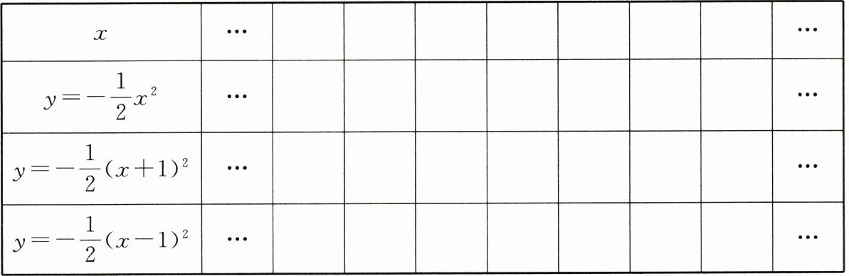 【探究】先填表,再在同一平面直角坐标系中,画出二次函数 $ y = -\frac{1}{2}x^2 $,$ y = -\frac{1}{2}(x + 1)^2 $ 和 $ y = -\frac{1}{2}(x - 1)^2 $ 的图象,并探究它们的图象特点和性质。